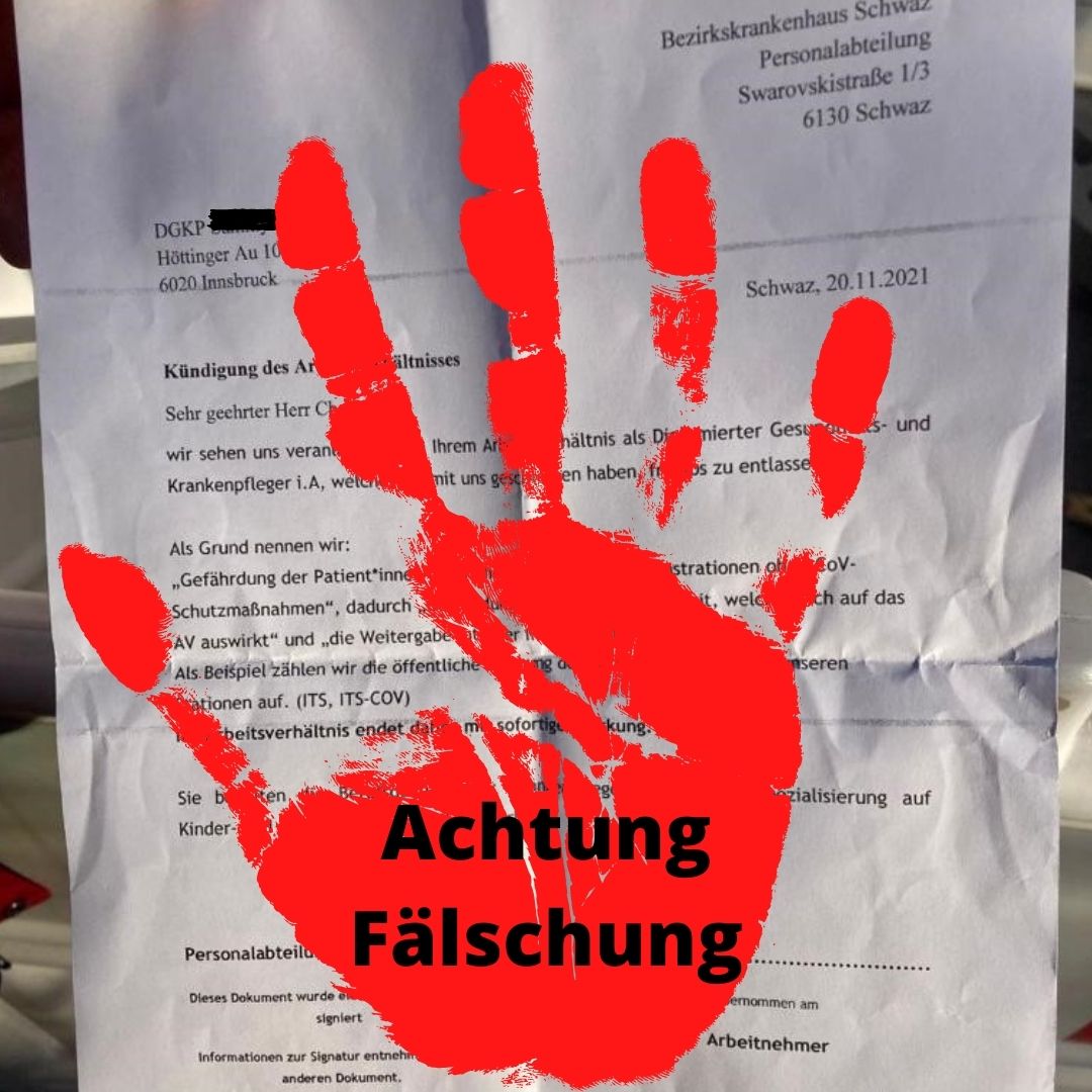 Dieses Schreiben stammt nicht vom BKH Schwaz und die im Schreiben erwähnte Person hat nie am BKH Schwaz gearbeitet. Außerdem wurden aktuell keine Kündigungen oder Entlassungen von Dienstgeberseite ausgesprochen.